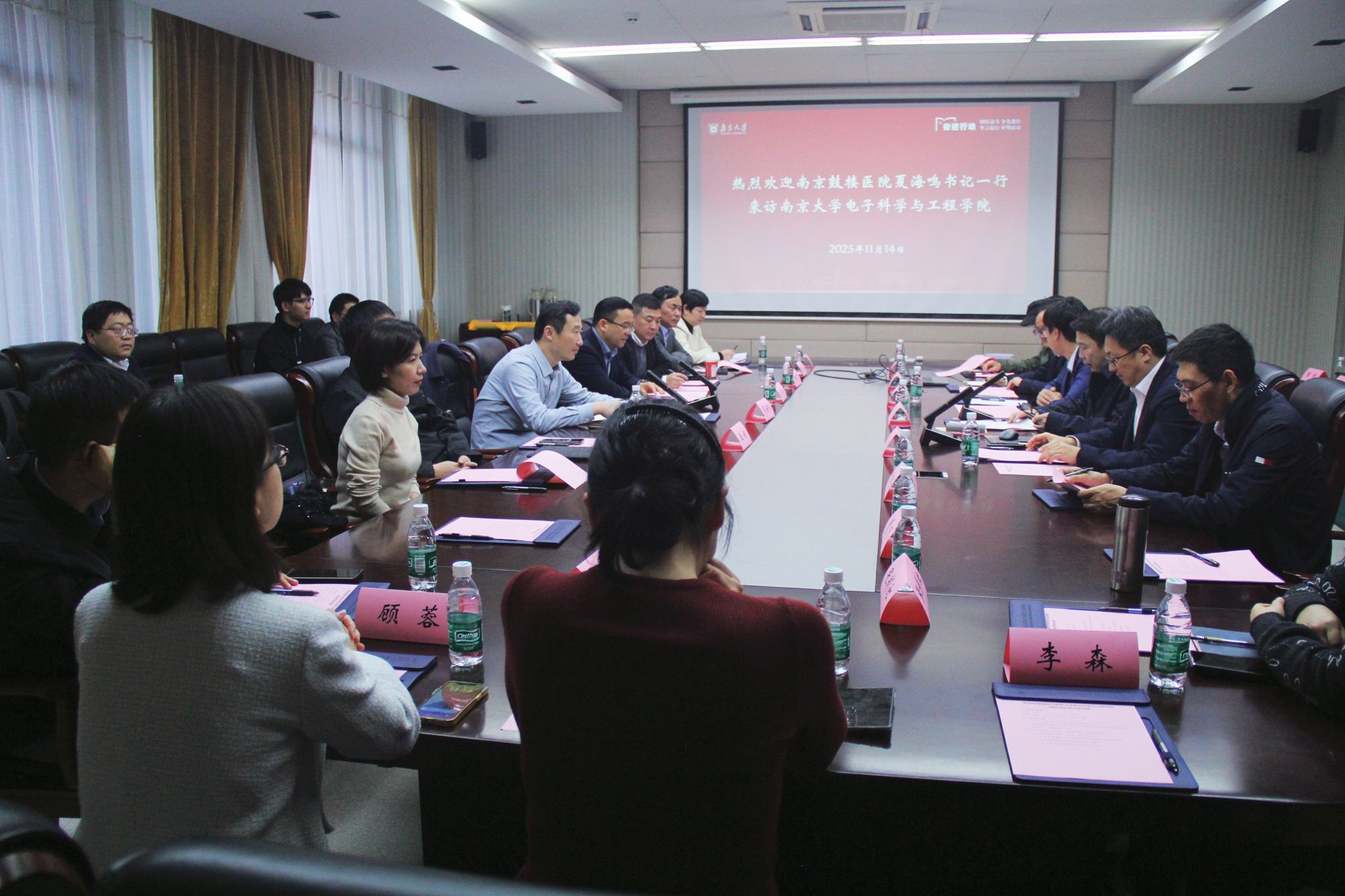 2025年11月14日,哔咔漫画 与南京鼓楼医院在仙林校区潘忠来楼举办医工融合合作交流会。南京鼓楼医院党委书记夏海鸣、副院长周敏,哔咔漫画 党委书记张昊、院长刘斌等领导专家出席会议。